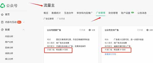 达到要求后去公众号电脑端后台-手动开启-底部广告和文中广告。
