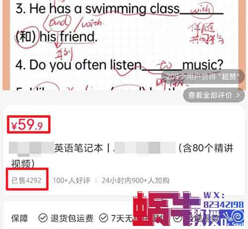 你们看看下面在这个英语学习资料项目中,一份学习笔记的售价是59.9元,目前已经售出了4292份。