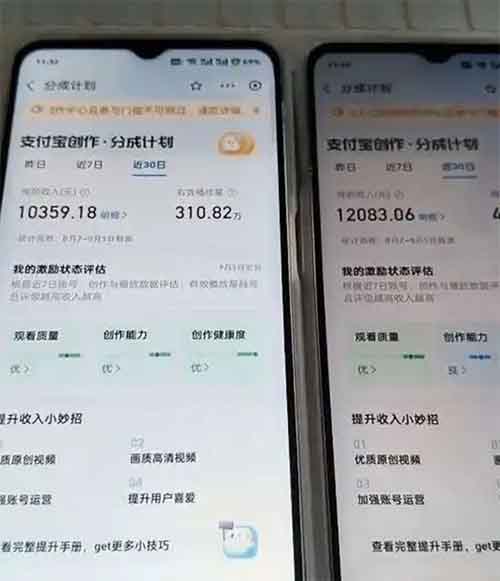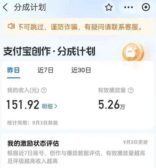 更重要的是,支付宝生活号的分成比例非常诱人,每1万次播放量大约能赚取30到50元,比其他主流视频平台高出不少。