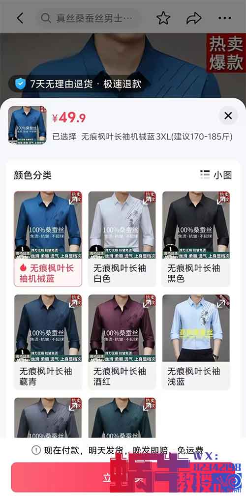 品类:咱们去搜索 蚕丝 山羊绒 一定得买500块钱左右,超过500就异常不给赔付。下完单之后 告诉商家一定要百分百发蚕丝的货,然后商家回复什么都不要管它 电话也不要接,