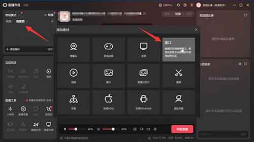 接下来就是需要选择直播的场景画面,直播的画面有多种方式:摄像头、游戏、全屏、窗口、视频、图片、幻灯片、截屏等等,一般我们用到的是窗口这个。