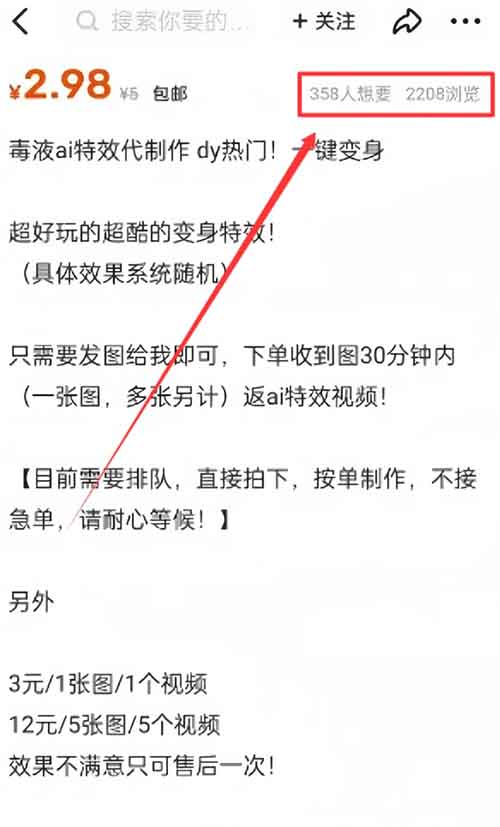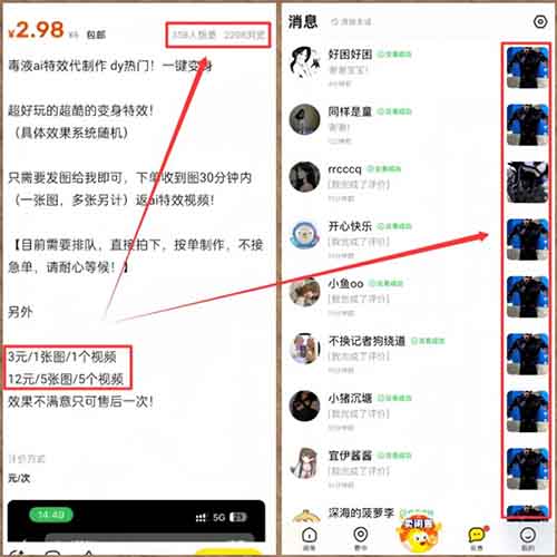 如上图,她在闲鱼帮别人代做毒液变身视频,1个视频收费3元,5个视频12元,一天卖了60多单,纯利润200+。