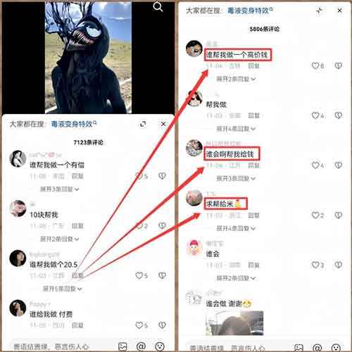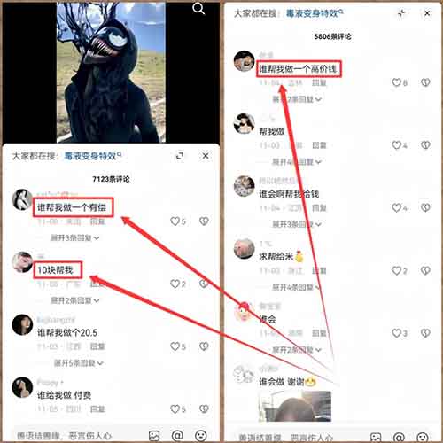 原理很简单,说白了就是用AI帮别人制作毒液变身视频,大家自己去抖音的评论区翻一下,就知道需求有多大了。