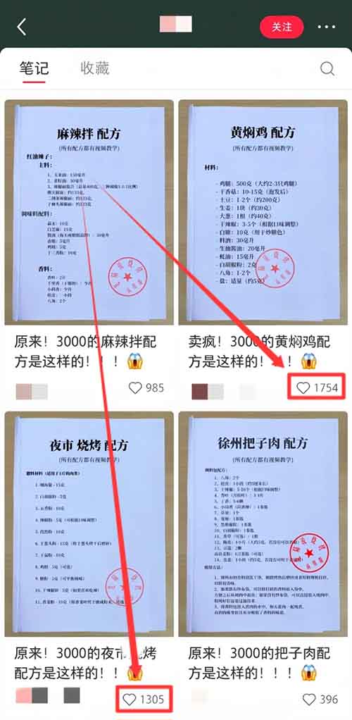 简单来说,就是在小红书发布和小吃相关的笔记,吸引感兴趣的人群,然后把配方资料卖给他们,如下图。