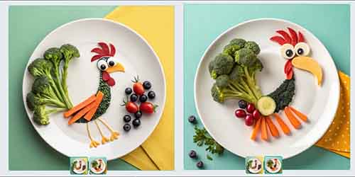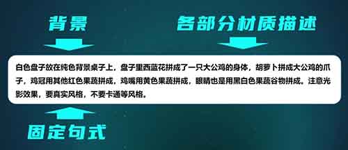 第二大部分相对来说比较简单,就是摆盘的各部分的材质的描述,比如说要摆一个大公鸡,我就说:盘子里用西兰花拼成一个大公鸡的身体,用胡萝卜拼成大公鸡的爪子,眼睛是用黑色的谷物拼成,鸡冠、鸡嘴都用什么,分别是什么颜色的,都规定好。