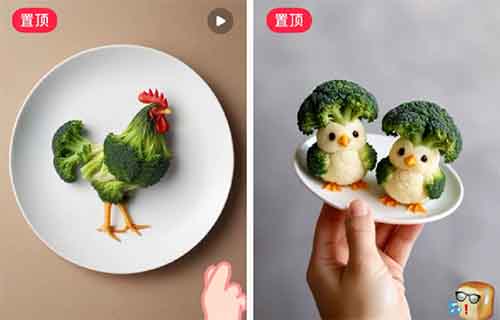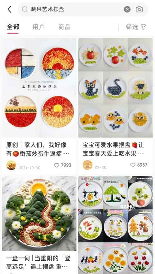 接下来一步一步来说,首先是找选题,找选题很简单,直接去搜关键词就可以了,比如说蔬果艺术摆盘,各个平台上都有很多。