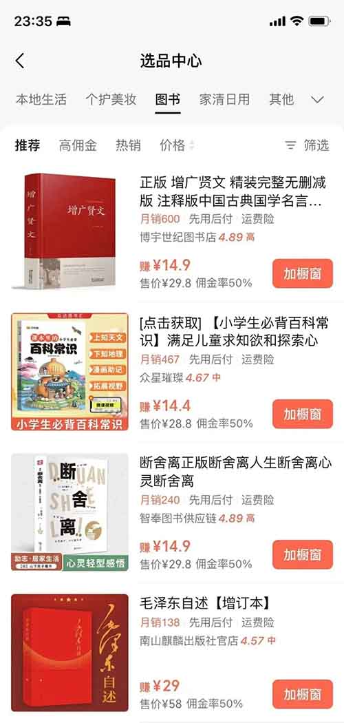 从这个账号的数据看,16条内容卖出6000多件商品,变现能力很强。图书类商品的带货佣金通常不低,大多在50%左右。比如,选品联盟里的很多图书,佣金可以达到一半。