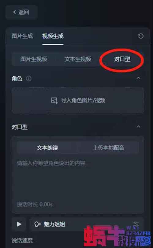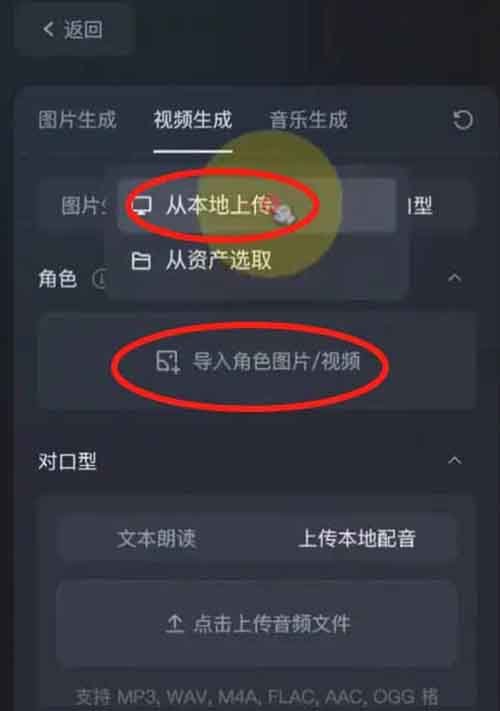 点一下这个对口型,然后在角色这个地方点一下,导入刚才得到的视频文件,选择从本地导入。