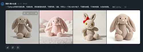 等一会儿之后,他就给到了四张图片,图片里玩具的材质,还有毛绒绒的感觉,这个在提示词里边都给它规定好了,所以生成的非常符合咱们的要求。
