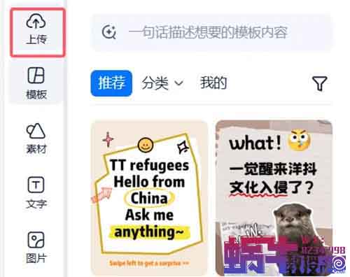 然后,把刚才下载好的女老板照片上传,点击左边工具栏的【上传】。