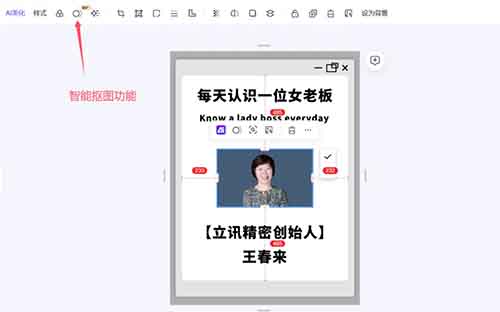 把上传好的女老板照片添加进笔记中,然后使用AI抠图功能,把照片的背景扣掉,就得到一张透明背景的照片。