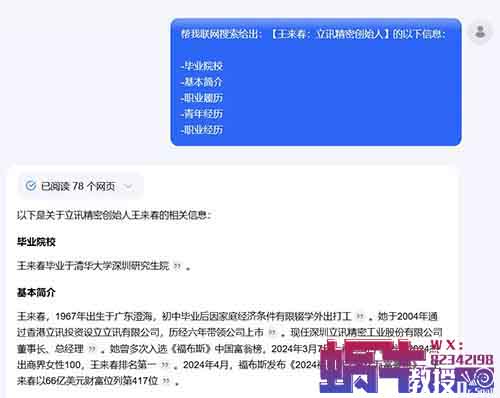 选定一位女老板,接着让AI查找网上所有关于女老板的信息资料,并且整理成我们需要的格式。
