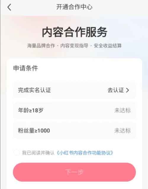 但是小红书官方有个硬性要求,要想走官方渠道接广告,要求至少你要有1000粉丝,才能够拥有这个资格。