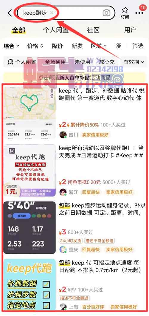 很简单,先去闲鱼搜索Keep跑步,找一个做得比较的同行,把他的标题、文案全部复制下来,如下图。