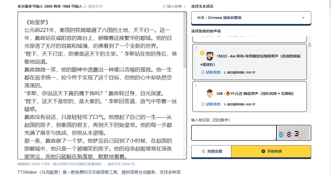 配音这一步就很简单了,网上有很多这样的小程序或者软件,大家挑一个去合成即可。