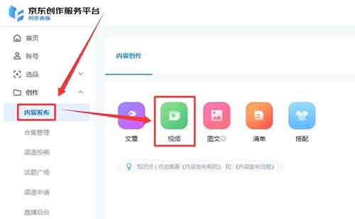 打开京东创作服务平台,依次点击左侧导航栏的【创作】、【内容发布】,选择【视频】发布即可,如下图。