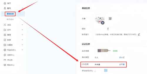 登录进去后,依次点击左侧导航栏的【账号】、【基础信息】,完善你的个人身份信息,并开通CPS权限,如下图。