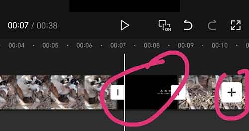 接下来,添加每个素材的转场效果,滑倒两个素材的中间,点击加号,添加转场动画,1-2秒左右的就行。